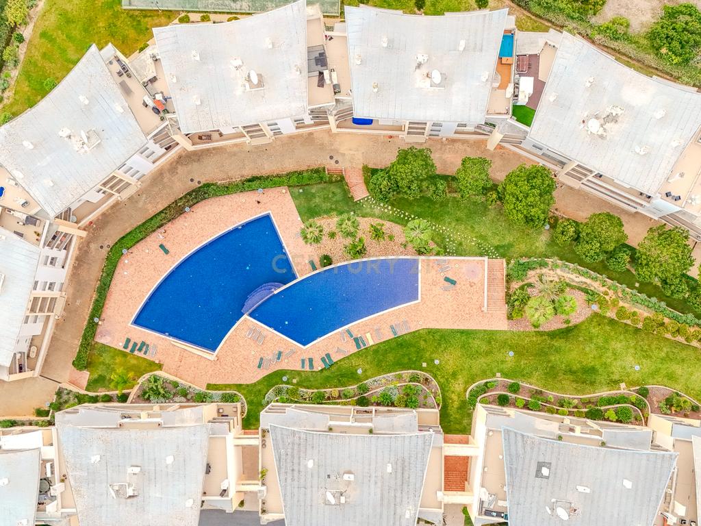 O condomínio distingue-se pelas suas duas amplas piscinas, campo de ténis, jardins e zonas comuns cuidadosamente mantidas, criando um ambiente sereno e ideal para desfrutar do clima algarvio durante todo o ano.