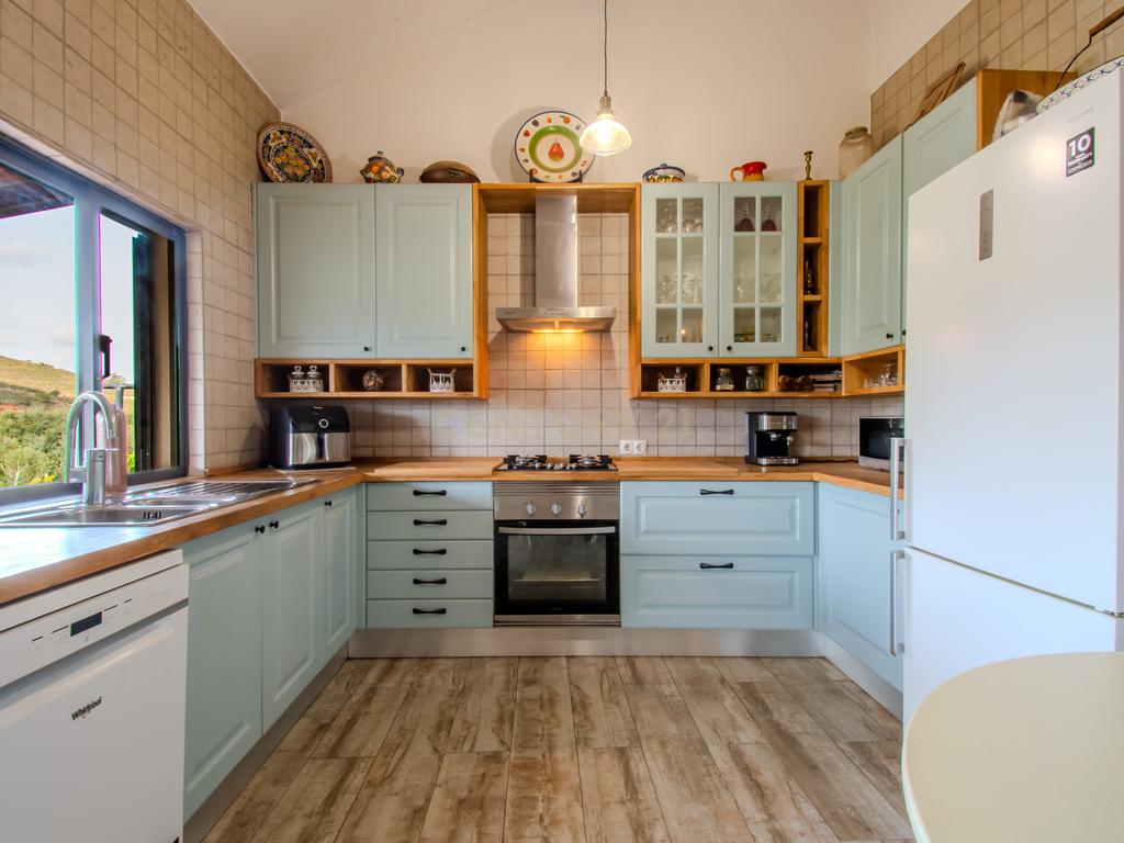 A cozinha encontra-se equipada com fogão, forno, exaustor e termoacumulador. O sistema de gás é através de garrafa.