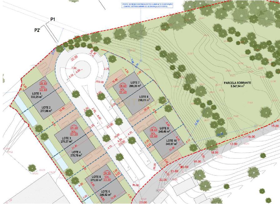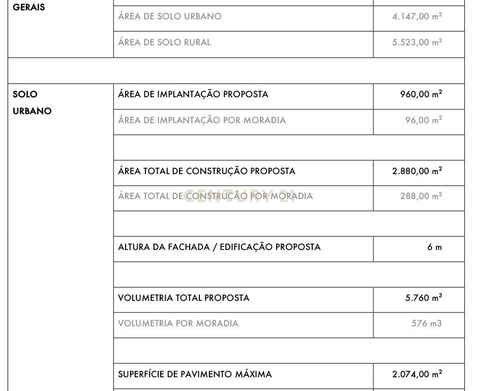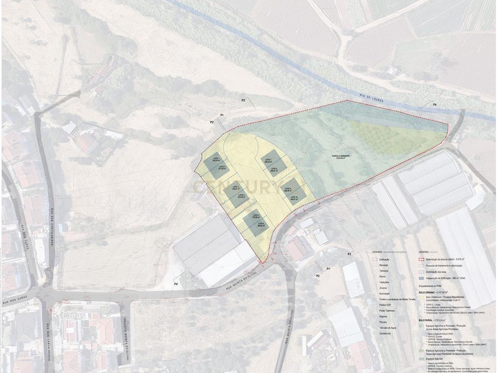Lote de terreno com 9.670 m² de área total, composto por 4.147 m² de área urbana e 5.523 m² de área rural, com Pedido de Informação Prévia (PIP) aprovado para a construção de 10 moradias unifamiliares.