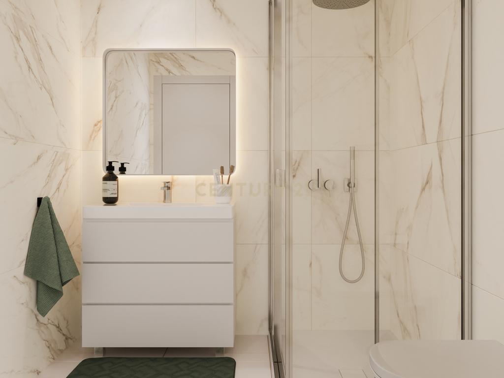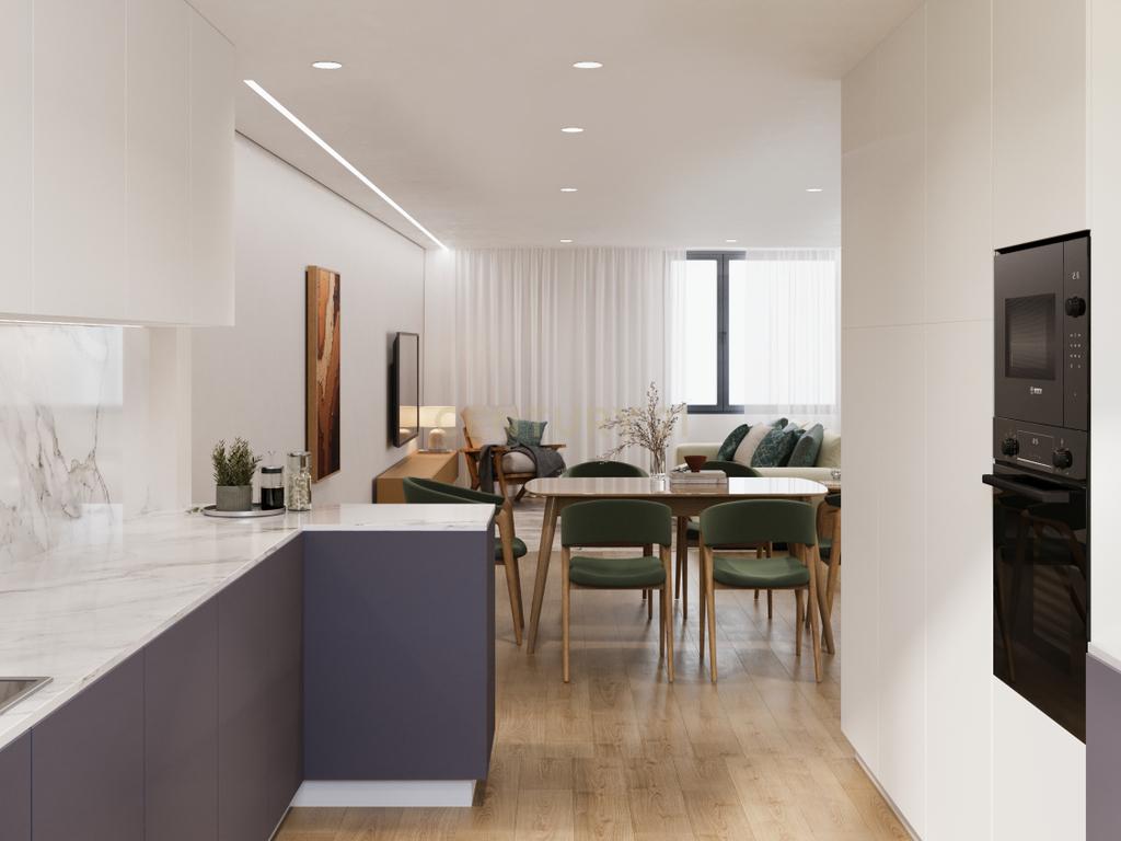 O prédio contém fachada frontal ventilada, dotando o edifício com um sistema térmico altamente eficaz e sustentável. O apartamento dispõe de uma sala de área generosa, 2 quartos, incluindo uma suite com casa de banho privativa, e 2 salas de banho no total. Dispõe ainda de um lugar de estacionamento e arrecadação. Com uma excelente exposição à luz natural, o espaço é complementado por acabamentos de luxo, como ar condicionado, janelas duplas, estores elétricos e um elegante chão vinílico de tom taupe. A cozinha lacada e completamente equipada, as salas de banho com móvel lacado, torneiras do lavatório e duche ambas de parede, marca Grohe, divisórias de duche em vidro e sanitários suspensos da marca Roca.