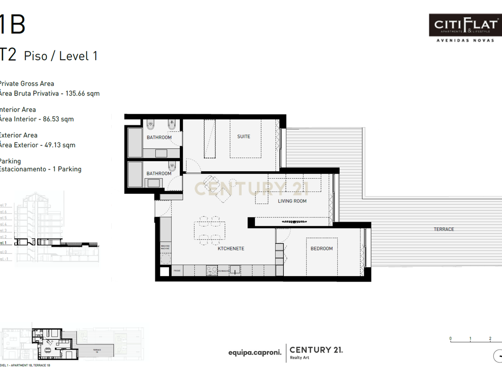 Essa unidade é um T2, designada fração 1B, localizado no 1o. Piso, com 136,06 m2 de ABP, sendo 86.93 m2 de área interior e 49,13 m2 de área exterior. Essa unidade terá terraço e 1 lugar de estacionamento. (Ref.: C0364-01054)