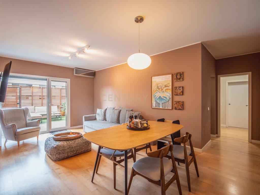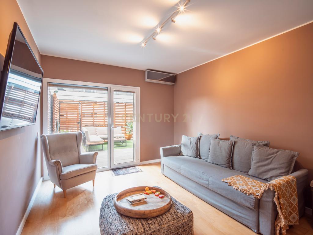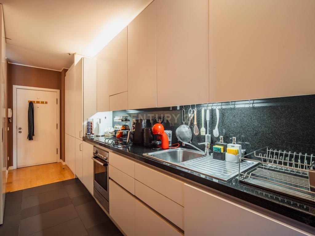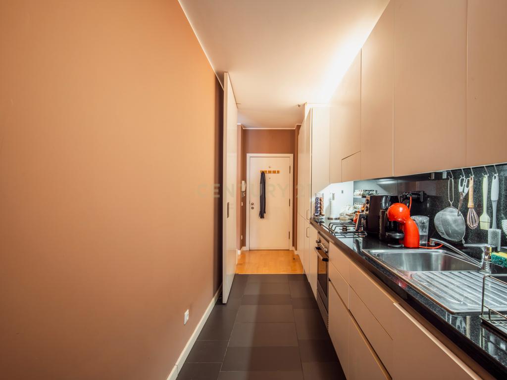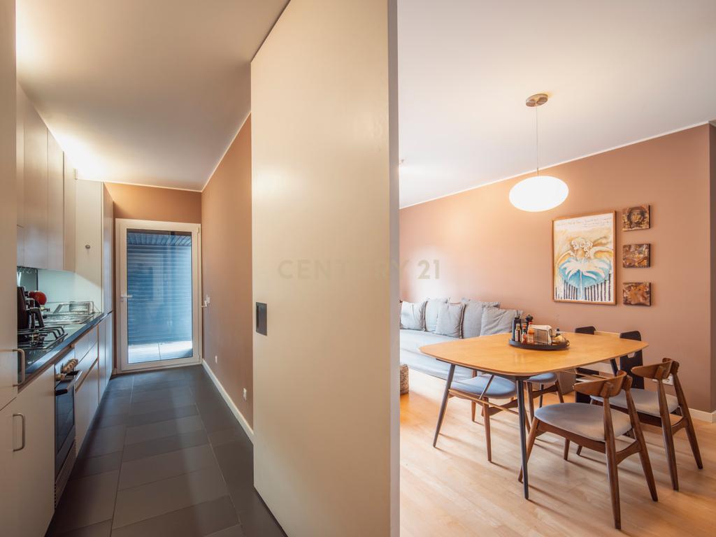 A cozinha encontra-se totalmente equipada e conta com uma elegante porta pivotante do chão ao teto, conferindo sofisticação e versatilidade ao ambiente. A sala ampla e luminosa prolonga-se para um extraordinário terraço privativo — um verdadeiro diferencial — ideal para refeições ao ar livre, momentos de convívio ou para criar uma zona lounge exterior com total privacidade.