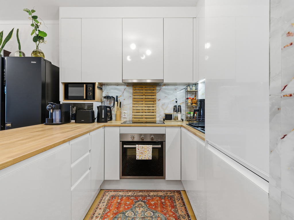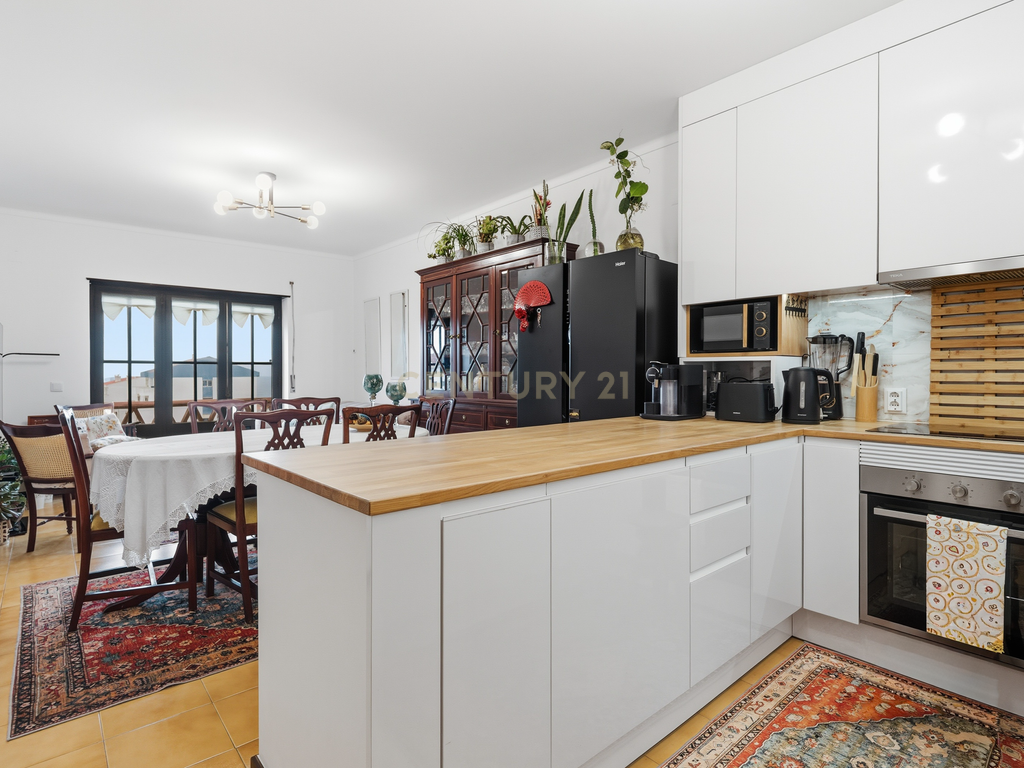 A cozinha foi renovada há cerca de 1 ano, com mobiliário feito à medida e bancada em madeira maciça. Encontra-se equipada com eletrodomésticos encastrados recentes, incluindo termoacumulador de 120L.