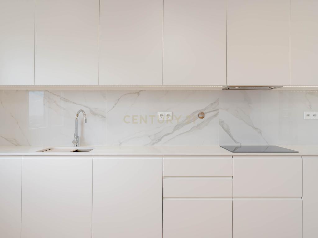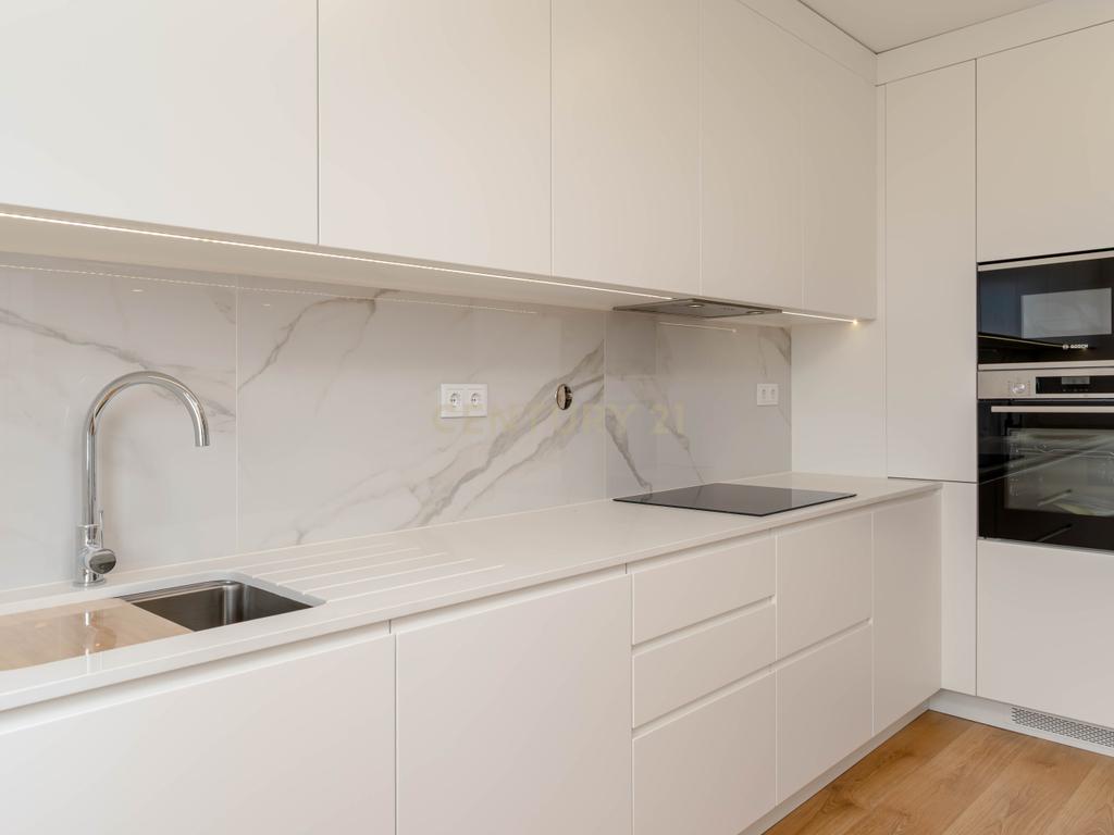 O layout funcional desenvolve-se a partir de uma generosa zona social em open space, onde se articula a sala de estar com a cozinha de configuração americana, equipada com electrodomésticos encastrados Bosch. A zona privada é composta por três quartos, um dos quais em suíte, e duas instalações sanitárias completas. A ligação ao exterior é assegurada pelas duas varandas que pela sua amplitude prolongam os limites do espaço habitável com os da envolvente.