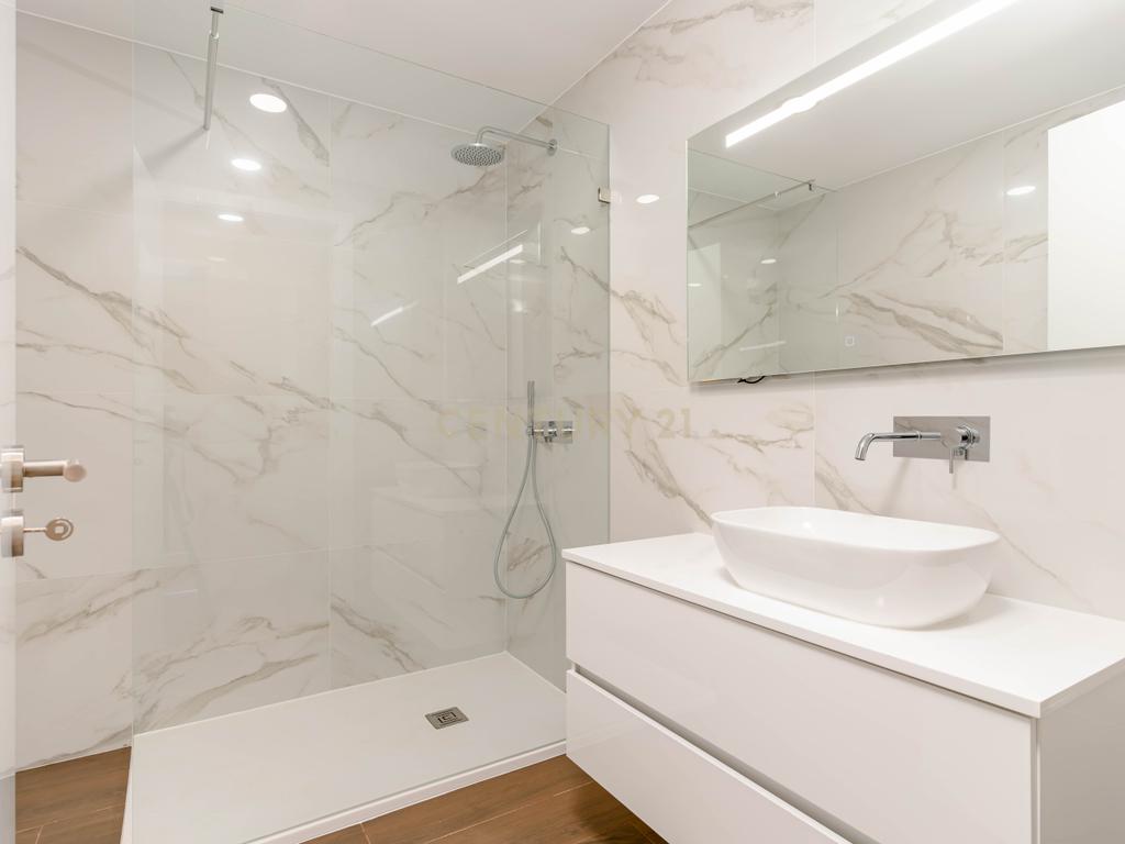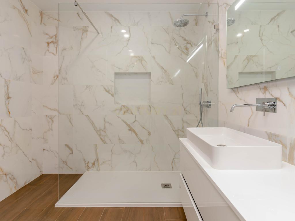 Características idênticas às da suíte: revestimento cerâmico, ventilação mecânica, loiças brancas, teto falso em gesso cartonado com iluminação LED, base de duche com vidro temperado, móvel suspenso e torneiras embutidas