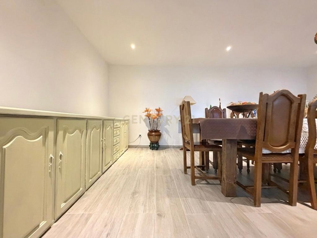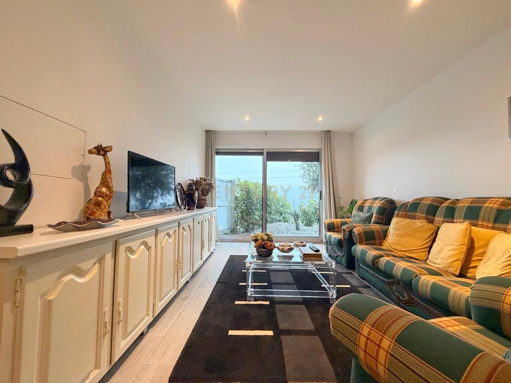 No rés do chão, encontramos uma cozinha prática, uma ampla sala de estar e jantar com ambiente acolhedor, um WC completo e uma lavandaria, proporcionando uma vivência confortável e adaptada ao dia a dia.