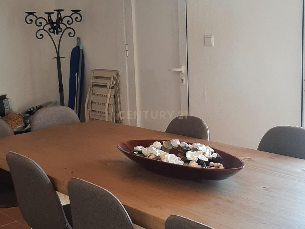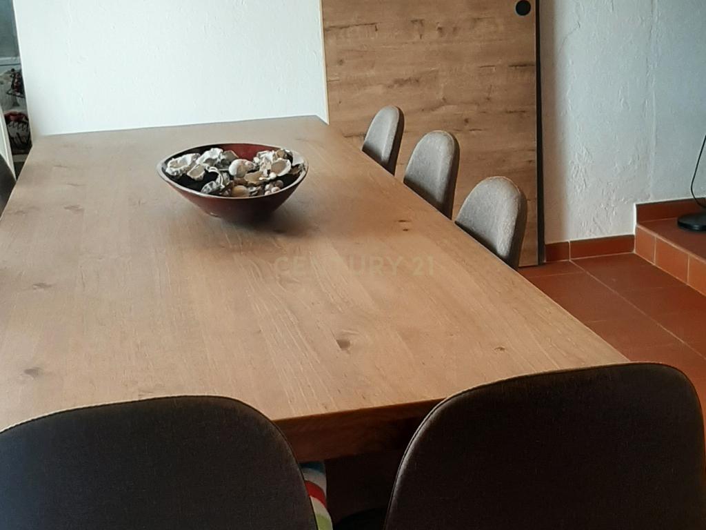 • Sala de refeições com mesa tampo em madeira de 3 metros, teto em palhinha