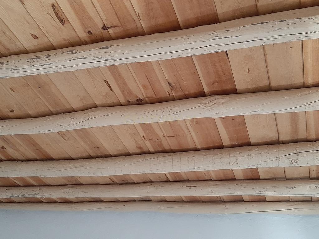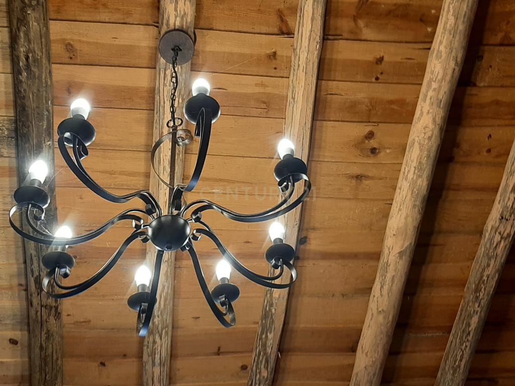 • Sala de estar ampla com teto rústico e salamandra