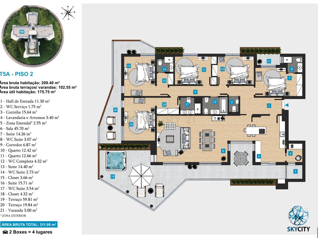 Com uma área total de 185.576 m² e mais de 121.000 m² de construção, o SkyCity integra apartamentos, moradias e espaços comerciais, num conceito que combina natureza, arquitetura contemporânea e qualidade de vida urbana