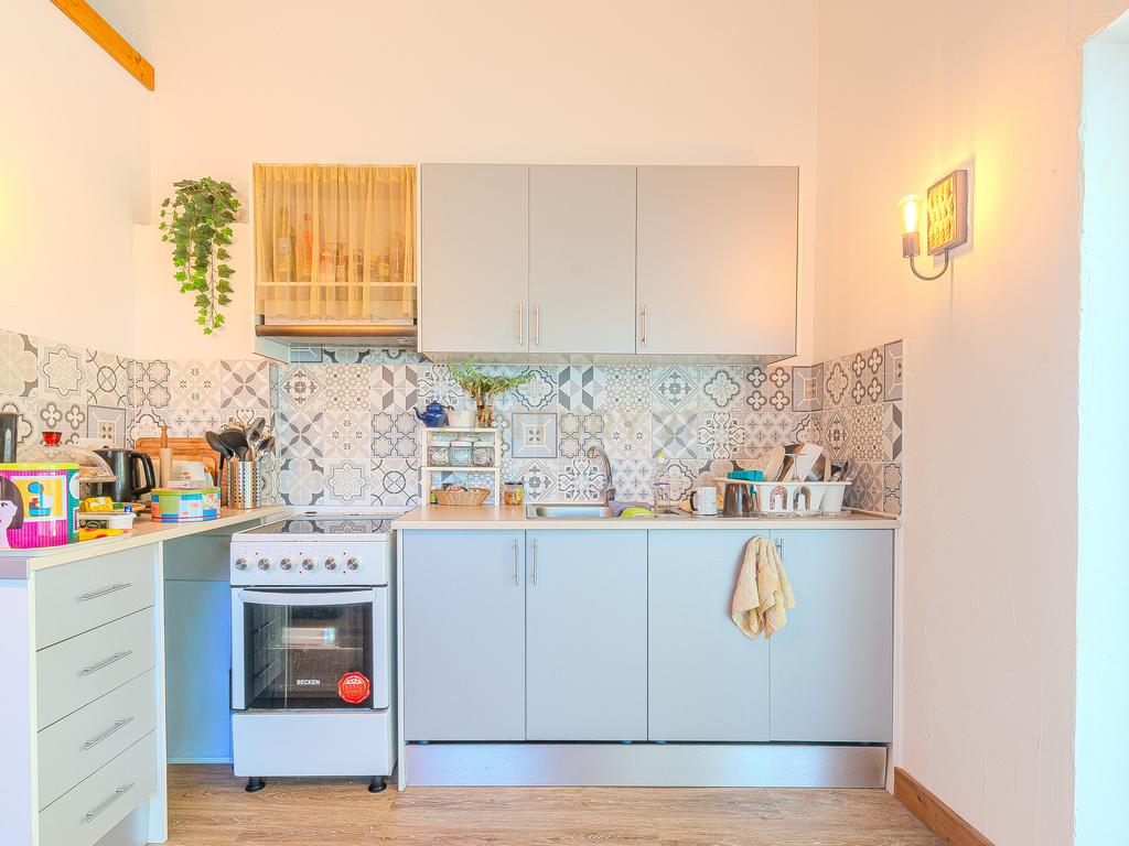 The guest house, also single-story, consists of two bedrooms, one bathroom, and an open-plan living area with a fully equipped kitchen.