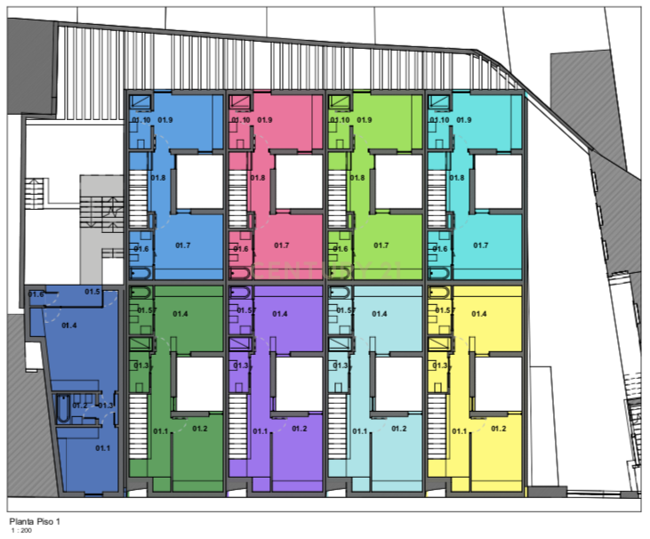 Com um grande enfoque na luz natural, o projeto desenvolveu-se com a criação de pátios na zona mais a sul das habitações, garantindo assim elevada iluminação natural de boa qualidade ao longo de todo o ano e potenciando uma relação com o exterior dos espaços que estes servem.
